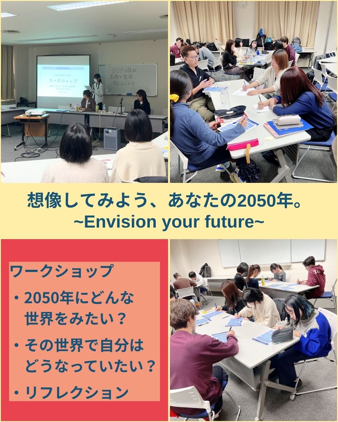 第2部では、参加型のワークショップ「想像してみよう、あなたの2050年。~Envision your future~」を行いました。グループに分かれて行ったディスカッションでは、各々が抱く2050年のカタチについて、活発に議論が出来ました。